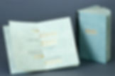 The typeface is Optima, letterpress printed (using polymer plates), and the images are plate lithographs and screen-prints; the paper is Stonehenge; the structure is accordion, with a soft cover. For display purposes, one side of the spine can be slipped out.